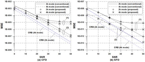 Figure 5 presents the MSE comparison between the conventional and proposed LS estimators when , , and ppm. The CRBs using (38) and (39) are also presented as a baseline reference. It can be seen that the MSE performance is the same for both schemes and all algorithms suffer from an error floor for higher SNR values, regardless of the transmission mode. In practice, the conventional joint LS estimation scheme cannot be directly applied to the ISDB-T system because of an unknown phase of TMCC signals, whereas the proposed estimation scheme resolves this problem using the repeated property of TMCC signals as done in (17). The performance difference between 2k and 4k modes becomes more visible in the case of SFO estimation. This is because the performance of the SFO estimation scheme relies on both the number and location of TMCC subcarriers as in (37), whereas the CFO estimation performance is dependent on only . In order to examine the effect of bias caused by the use of non-uniformly distributed pilot, we also consider the scenario that there is no ICI. In this case, one can see that the bias of the proposed scheme is more significant than that of the conventional scheme at the high SNR. Regarding the number of flops when , the proposed estimation scheme needs real flops, whereas the conventional estimation scheme requires . Considering that , the complexity of the proposed scheme is slightly increased by 11% and 13% in comparison with that of the conventional scheme considering 2k and 4k modes, respectively. In summary, we confirm that the information-carrying TMCC signal can be efficiently used for reliable joint LS estimation of CFO and SFO, achieving a satisfactory performance with moderate computational burden.