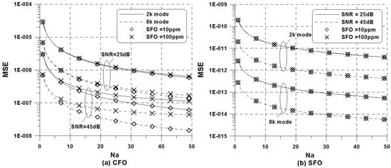 - Kim, Y.H.; Lee, J.H. Joint maximum likelihood estimation of carrier and sampling frequency offsets for OFDM systems. IEEE Trans. Broadcast. 2013, 57, 277–283. [Google Scholar]