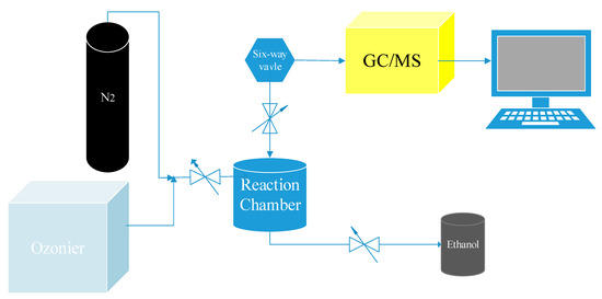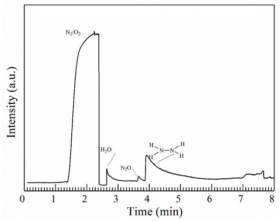 Before each runs, the reaction chamber was flushed with the pure N2. The blanked sample was analyzed to make sure that the gas in the reaction chamber was pure. Then the reaction chamber (500 mL, cylinder) was evacuated. The samples (N2H4 10 μL, MMH 10 μL, UDMH 10 μL) were injected into it. After 5 min, the chamber was flushed with different concentration ozone until the pressure reaches 1.8 bar pressure. Then the reacted samples were detected by the GC-MS through the six-way valve on line. To further investigate the intermediate reaction in the presence of O3, the chamber was flushed with O3 after the experiments of each sample. Each operation was repeated three times. The reaction chamber was thoroughly flushed with the pure N2, and the exhaust gas was washed with ethanol solution to remove the toxic gas (NDMA, etc.). Each sample was detected through GC-MS (7890A-5795C, Agilent, Santa Clara, CA, USA), based on the calibrated internal standards. Separation was performed on a DB-225S (30 m × 250 μm × 0.25 μm) capillary column. The conditions of the GC-MS were as follows: helium as the carrier gas at a rate of 1.5 mL/min, the temperature of the injector 35 °С, column from 35 °С to 150 °С with a rate of 10 °С/min; the split ratio 1:1.