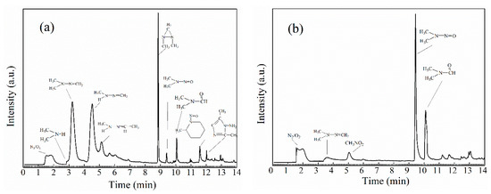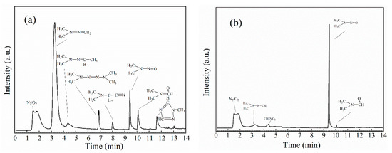 Gas chromatogram of the ozonation products of methylhydrazine: (a) O3/UDMH ≈ 1:1; (b) O3/UDMH ≈ 10:1.