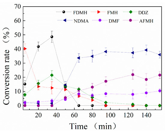 Within 60 min, the yields of FDMH, FMH and DDZ increase at the early stage and then decrease. Hence, the FDMH, FMH and DDZ are proposed to be the intermediates during the ozonation process. Moreover, the amounts of NDMA, DMF and AFMH increase during the ozonation process. When the FDMH decreases sharply within 40–60 min, the NDMA increases sharply. So the FDMH may convert to the NDMA during ozonation. This is consistent with the result that relatively high molar NDMA yields 95% during FDMH ozonation in aqueous [23].