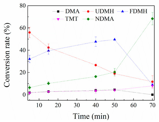 With the consumption of UDMH, the main products FDMH, NDMA, DMA and TMT are generating. The concentration of FDMH (47.5%) increases quickly at first 10 min and reaches to a peak at 40 min through a 20 min terrace, after which it decreases and is consumed over 50 min. NDMA generates slowly at the first 40 min and then increases faster. The sharp increase of NDMA may be due to the FDMH consuming. The concentrations of TMT and DMA are almost unchanged with the ozone injection, indicating that they are in low reactivity with ozone. The molar NDMA conversion rate of UDMH is 57.4% after 70 min.