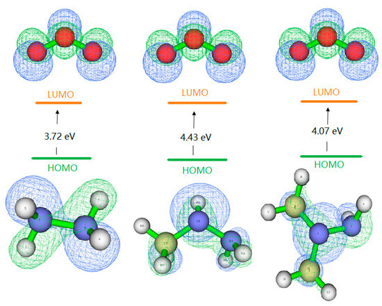 The frontier molecular orbitals [24] are often used to reveal the relationship between the electronic and geometric structures and to obtain qualitative information about the optical and electrical properties of molecules. The charges are computed by finding the electron population of each atom (Multiwfn) [25]. The result is that the energy gaps between the lowest unoccupied molecular orbital (LUMO) of O3 and the highest occupied molecular orbital (HOMO) of H2H4, MMH, UDMH are smaller than that between the LUMO of HH, MMH, UDMH and the HOMO of O3, respectively. Thus, the reactions occur through the electron transfer from the HOMO of H2H4, MMH and UDMH to the LUMO of O3, suggesting an electrophilic attack of O3 to the hydrazines. The plots of energy levels, HOMO and LUMO are presented in Figure 9.