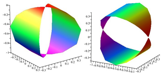 For the characters of ruled (helicoid) and rotational surfaces, please see Bour’s theorem in [18]. Do Carmo and Dajczer [19] showed the existence of surfaces isometric to helicoidal ones by using Bour’s theorem [18]. Güler [20] studied a helicoidal surface with a light-like profile curve using Bour’s theorem in Minkowski geometry. Furthermore, Hieu and Thang [21] studied helicoidal surfaces by Bour’s theorem in four-space. Choi et al. [22] studied helicoidal surfaces and their Gauss map in Minkowski three-space. See also [23,24,25,26]. Güler, Magid and Yaylı [27] studied the Laplace–Beltrami operator of a helicoidal hypersurface in .