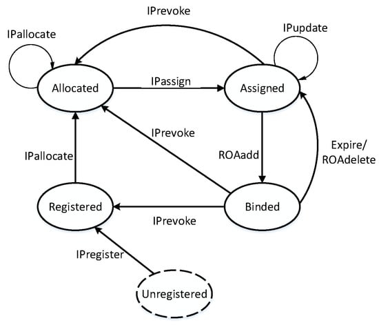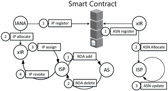 Figure 1. We note that an IP address resource assignment refers to an established lease with a valid period. The owners of certain resources are in charge of updating resource states after their expiration date. An IP revocation operated by its owner during its leasing period is only permitted if the resource leasee’s consent is attached.