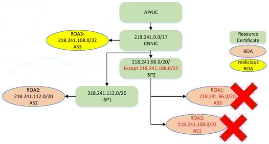 Figure 5. In the framework of RPKI, every entity has its resource certificates, and every ROA is issued by an EE certificate (which is for an end entity and not allowed to issue its child certificate). The malicious authorities have the ability to do attacks as follows: