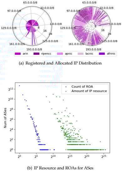 , where the registered IP block has the prefix length of 24. The right pie chart shows the allocated or assigned IP prefixes’ distribution in five RIRs, where we observe that a few IP numbers have not been allocated or assigned. The IP numbers held by ASes and the number of ROAs bound with ASes are shown in