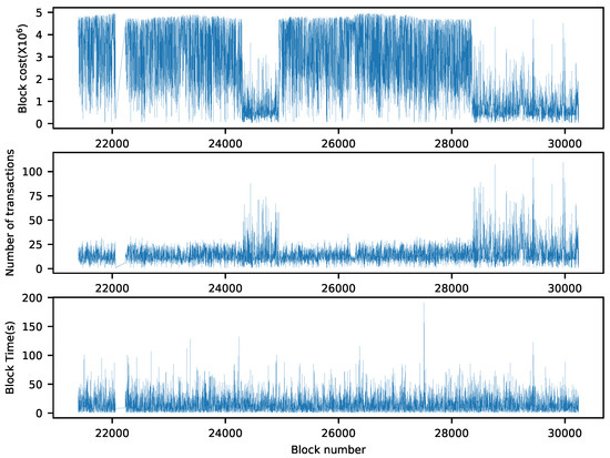 Figure 7. Since we experiment with the setup phase in parts at several different times, we only show one part of our blockchain data as a sample. The average block time for mining is 25 s, and the number of blocks containing transactions is more than 8000, resulting in nearly six days to complete the entire setup phase. This again explains why the time cost of setup is dominated by the smart contract, instead of the data owner, like in existing centralized search schemes.