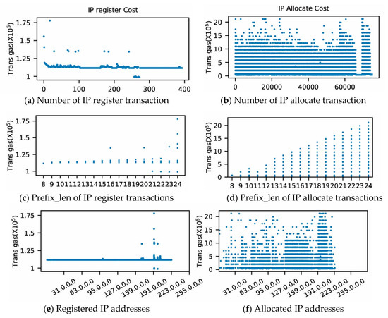 Figure 8. We experiment with the cost performance on more than 70,000 transactions reporting the real-world allocations and assignments of IP numbers. From the top row of the subfigures, we can tell that the allocation of IP numbers from an aggregated IP block costs far more than the cost of registering an IP block for an entity. We observe from the middle row figures that the highest cost of an