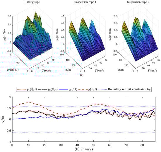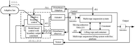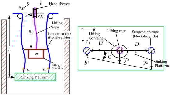 The multi-rope parallel suspension lifting system (MPSLS) has many advantages over rigid robotic manipulators, such as lightweight characteristics, heavy payload capability, high transportability, and low energy consumption; which has gained much attention and has been addressed in numerous researches for decades [,]. The MPSLS consisting of a head sheave, a lifting rope with a lifting container attached at the bottom, two suspension ropes, and a sinking platform is illustrated in Figure 1. Such a multi-rope system has long flexible suspension ropes in parallel, moving towards deeper mine wells or ocean waters. Since the suspension rope of the multi-rope parallel suspension system is flexible, the transverse vibration of the flexible suspension rope induced by an unknown boundary disturbance, suggests that distributed and concentrated force is inevitable that limits the utility of the systems [,]. Transverse vibration of the system should be controlled and suppressed to avoid premature fatigue failure.