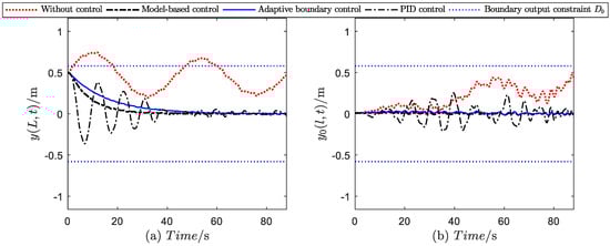 A nonhomogeneous and coupled PDEs-ODEs Equations (9)–(17) is used to describe the model of the MPSLS with time-varying geometric constraint and boundary disturbance, which is quite different from the model with a simple form []. Thus, another innovation of the paper is the consideration of the multiple constraints in the boundary control for the MPSLS.