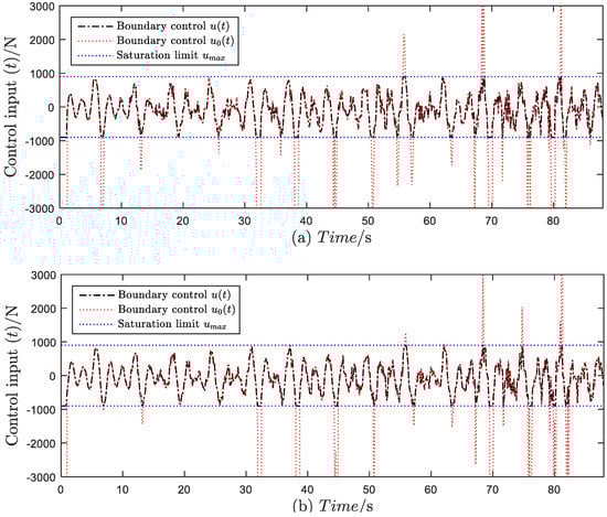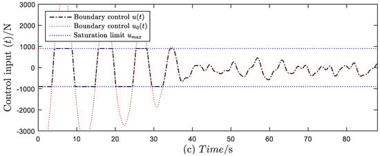 Nonlinear dynamics of hydraulic actuators and electric servomotors are generally subjected to a wide variety of constraints, including input saturation [,], dead zone [], safety specification, and hysteresis [,], etc. Actual physical input saturation on hardware is typically denoted as a magnitude constraint on control input, such as the maximum thrust that a space thruster for a flexible aerial refueling hose can provide [,]. Based on the quaternion formulation of the dynamic equations, input saturation is recommended to reduce the actuation for unmanned aerial vehicles with a backstepping method []. A model reference adaptive control is investigated for a time-invariant system, where the plant is stable and of minimum phase with input saturation [].
