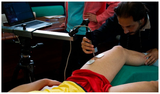 TMG was used to measure the radial muscle belly displacement of the biceps femoris (BF) and rectus femoris (RF) in both of the limbs. The TMG assessments were performed following the protocol described by García-García et al. [31,32]. The BF was measured with the subject in the prone position, with the knee joint fixed at a 15° knee flexion angle by means of a specially designed wedge cushion. The RF was measured in the supine position, with the knee joint fixed at a 40° knee flexion angle, once again by means of a wedge cushion designed for that purpose.