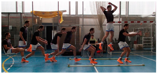 This test has been used to determine the flight time of the reactive force, but in a vertical displacement. It was designed by Bosco [28] and presents good validity and reliability with an ICC of 0.98 and coefficient of variation (CV) of 2.8% [37]. The test consists of performing a rapid flexion–extension of the legs with the minimum pause between the eccentric and concentric phase of the muscle contraction, with a free knee flexion to maximize the jump height [38]. The athlete must keep his hands on his hips at all times, and during the landing must actively seek the floor with his legs extended. Prior to the assessment, they were allowed to perform two jumps to facilitate their activation.