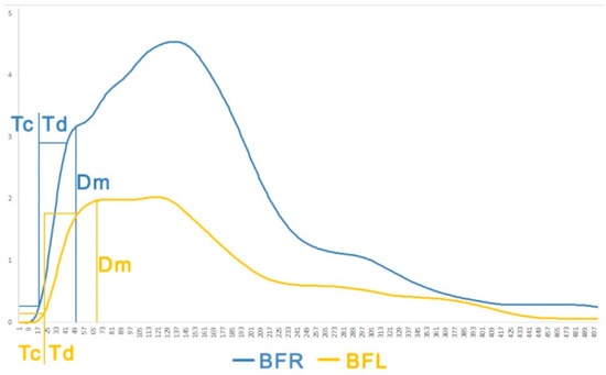 Lateral symmetry by tensiomyography graph of both of an athlete’s biceps femoris, where the absolute differences between the maximum radial displacement (Dm), contraction time (Tc), and delay time (Td) of the right and left leg can be viewed. Biceps femoris of the right leg shows a greater maximum radial muscle belly displacement, as well a greater reaction and contraction time than the left leg.