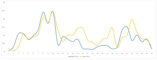 When establishing the possible relationships between the different measures of symmetry, the RMS variable by EMG was discarded, because of its very poor absolute reproducibility and relative poor to good reproducibility. This can be seen in the Figure 4, where there is a superposition of two RMS graphs of the rectus femoris of the same athlete, where the difficulty of reproducibility of this tool can be appreciated.