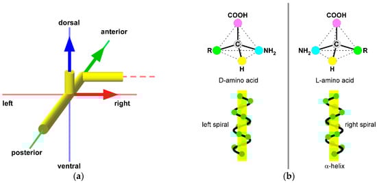 Determination of the left–right axis by molecular chirality. (a) Geometric relationship between the three axes; the anterior–posterior (A–P), dorsal–ventral (D–V), and left–right (L–R) axes. A hypothetical chiral “F-molecule” of Brown and Wolpert’s model specifies the L–R axis and its polarity. (b) Examples of chiral molecules. Amino acids and α-helix polypeptides.
