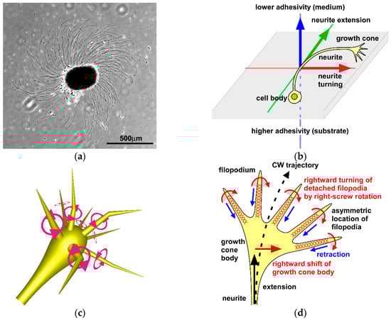 Chiral patterns in neuronal motility. (a) Clockwise neurite growth from explants of the mouse hippocampus on a poly-lysine-coated coverslip (top view). (b) Geometric relationship between the direction of the neurite extension, the axis of adhesivity (substrate-medium), and the direction of neurite turning. (c) Right-screw rotation of growth cone filopodia in 3D substrates. (d) Distortion of the growth cone driven by the right-screw filopodial rotation and clockwise turning of the growth cone on 2D substrates. (d) Modified from the literature [99] (CC-BY 4.0).