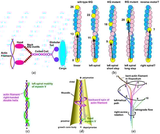Chiral rotation of filopodia driven by the left-helical myosin V motor. (a) Molecular structure of myosin V. (b) Stepping patterns of myosin V on actin filaments. Myosin V steps on the 11th or 13th actin subunits, generating a straight or left-spiral motion. 4IQ and 8IQ mutants are predicted to step leftward on the 9th and 20th subunits, respectively. A rightward-stepping motor would generate a left-spiral motion. (c) Left-spiral motion of free myosin V on a fixed actin filament. (d) Left-helical backward axial spin of an actin filament in a filopodium caused by a fixed myosin V. (e) Left-helical twirling of a bent actin filament driven by a retrograde flow and right-screw rotation.