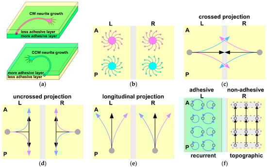 Here, I discuss the possible chiral patterns in the neurite projections, and their potential contribution to the formation of L–R asymmetric neural circuits in vivo (Figure 4). During development, many axons grow along the A–P or D–V axes [121,122,123]. For example, commissural crossed axons, which are widely distributed from the forebrain through to the spinal cord, initially grow ventrally along the D–V axis and cross the ventral midline floor plate [107]. If there is differential adhesivity along the apical-basal or ventricle-pia axis, which is orthogonal to both A–P and D–V axes, the ventrally growing axons would receive a CW or CCW bias. In the case of a CW (CCW) bias, the left axons would cross the midline at more posterior (anterior) positions, whereas the right axons would do so at more anterior (posterior) positions. In the case of the uncrossed ipsilaterally projecting axons that initially grow toward the midline, but then turn anterior or posterior, the CW (CCW) bias would increase the posterior (anterior) turning of the left axons and the anterior (posterior) turning of the right axons. In the case of the anteriorly growing axons, the CW (CCW) bias would drive the rightward (leftward) unidirectional turning of the axons on both sides. The above asymmetry is predicted only from the chiral property of the axons and the differential adhesivity of the substrates, without assumption of any L–R biased cues.