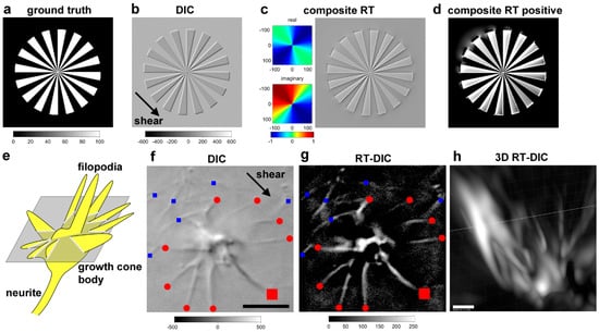 Riesz transform (RT)-differential interference contrast (DIC) microscopy for less-toxic label-free multidimensional imaging. (a) A radial grating image for the ground truth. (b) DIC image synthesized from (a). (c) Composite RT (right panel) of (b) after passing an RT frequency filter (left panels). (d) Thresholding of (c) by positive values. (e) Schematic of a growth cone for imaging. (f) DIC microscopic image of a growth cone. Red and blue dots represent filopodia and collagen fibers, respectively. (g) Composite RT of (f). (h) 3D rendering of z-scanned images of the same growth cone, from oblique view. Modified from the literature [99] (CC-BY 4.0).