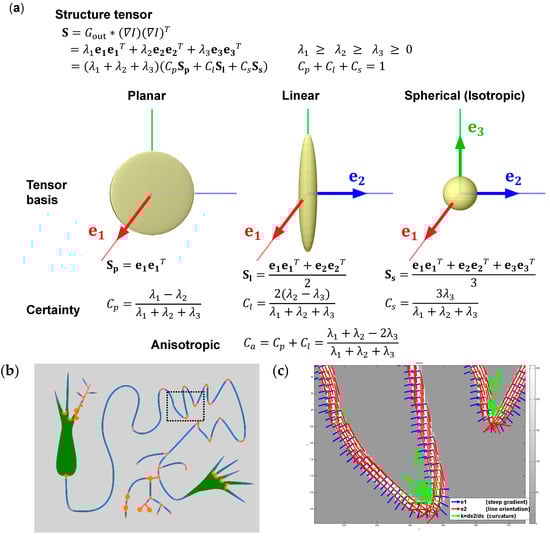 Morphological analysis with structure tensor. (a) Shape classification of the structure tensor. Structure tensor is calculated by the Gaussian smoothing (Gout) of a matrix composed of gradients of image intensity I. The tensor is decomposed into three tensor bases (planar, linear and spherical bases) and their certainty. Minor eigenvector e3 and its differential represent fiber orientation and curvature, respectively. (b) Feature analysis of a 2D synthetic image of a neuron. λ1 (blue) and λ2 (red) are overlaid on the image (green). (c) Distribution of principal (blue) and minor (red) orientations, and curvature (green) in dotted rectangle of (b). (a) is modified from the literature [99] (CC-BY 4.0).