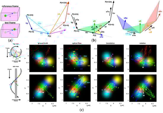 The best way to analyze the motility only from multidimensional images would be the optical flow analysis, which also comes from the field of computer vision. The optical flow is the point-wise displacement vector field calculated from two sets of images. We improved the classical 2D optical flow method by Horn and Schunck [129] for 3D image data and for multi-scale estimation [99] (Figure 7). From a series of five time-point image data, four velocity vectors (single-forward, double-forward, single-backward, and double-backward vectors) are calculated from the optical flow. The translational physical quantities (acceleration and jerk) are calculated by the numerical differentiation. rotational physical quantities, including the axes of rotation and the angular velocities (curvature, torsional, and total angular velocities), are calculated from the Frenet–Serret Tangent–Normal–Binormal (TNB) frames. These motion parameters are used for the quantification of the chiral motility, such as rotation and helicity.