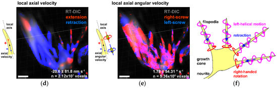 Kinematic analysis with optical flow. (a) Optical flow detects voxel-wise displacement or velocity vector fields V from two sets of images. (b) Calculation of the velocity (left), curvature (middle), and torsional (right) components of the rotation quantities from the four sets of optical flow vector fields. (c) Application of kinematic analysis of a right-handed ordinary helical motion of a synthetic sphere. (d,e) Voxel-wise axial velocity (d) and angular velocity (e) of neuronal growth cone filopodia. (f) Filopodia exhibit a left-helical motion with a retraction and right-screw rotation. Vf, Vff, Vb, and Vbb: single- and double-frame forward and backward optical flow vectors. Vn and Vp: velocity vectors derived from optical flow vectors. Vc: velocity at the central frame. A: acceleration. J: jerk. T, eTf, eTb, eTn, and eTp: tangent unit vectors. N: normal unit vector. B, eB, eBn, and eBp: binormal unit vectors. ωc: curvature angular velocity. Ωtf and ωtb: torsional angular velocity. W: total angular velocity. Modified from the literature [99] (CC-BY 4.0).