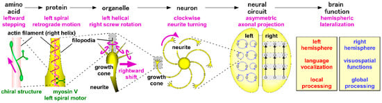 L–R brain asymmetry is a widespread property that is observed among various species. Human and non-human vertebrates seem to share common patterns of functional brain laterality. Evidence suggests that the left hemisphere is specialized for language–vocal functions and local information processing, whereas the right hemisphere is specialized for visuospatial functions and global information processing. The formation mechanisms of brain asymmetry are still unknown, but most of them are independent of those known to underlie body asymmetry. Here, a chiral neuron model is proposed for the formation of brain asymmetry (Figure 8). This model consists of the following steps: (1) molecular chirality of actin filaments and myosin motors generates the right-screw left-helical rotation of neuronal growth cone filopodia; (2) the filopodial rotation drives the CW turning of the neurites on adhesive substrates; (3) the CW neurite growth forms structurally asymmetric neuronal circuits and lateralized brain functions.