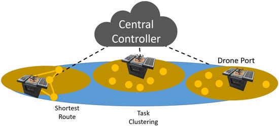In our model, we consider a central controller that is responsible for a set of drone ports that each have one drone. By using a central controller, we can assume that information containing the drone state, drone port and task state is available. Therefore, giving a large advantage over a completely distributed systems since information is accessible in a single place and can be used to increase the co-operation between drones waiting at drone ports.