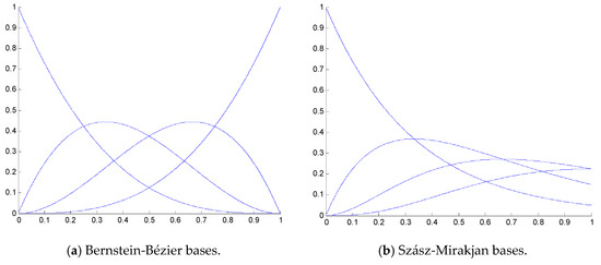 S-λ basis functions in interval [0, 1): Bernstein-Bézier and Szász-Mirakjan, where n = 3.