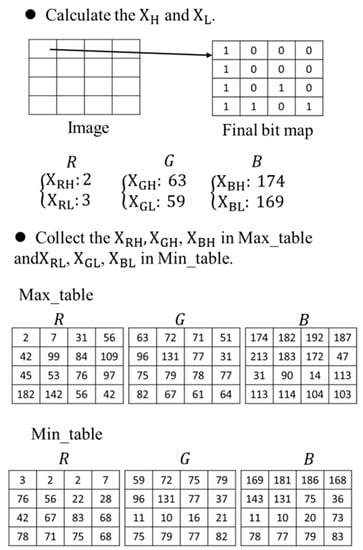 1. Generate BACOBTC Max Quantizer And Min Quantizer. For each color block, the quantization values, including , , , ,  are computed. Then,  is mapped to the red max quantizer table, and  is mapped to the red min quantizer table. Blue and green channels could do the same operations. The analyses of the min quantizer and the max quantizer are shown in Figure 2.