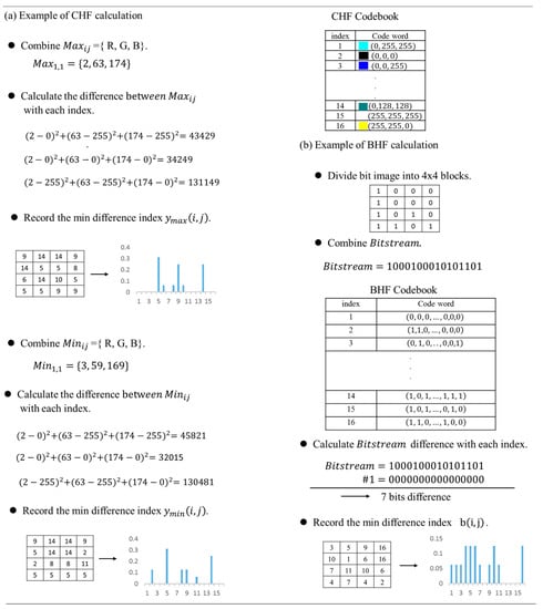 The bit pattern histogram feature can identify the texture and brightness of the image effectively. Figure 3b shows an example of the BHF computation. Similar to the CHF calculation, the procedures for computing  are described below.