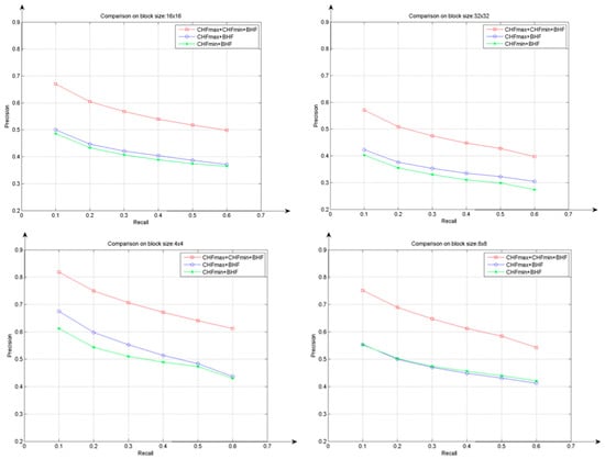 Figure 4 shows the precision recall values of the proposed BACOBTC feature descriptor under Corel 1000 database. In this experiment, in order to obtain feature descriptors, all images in the database are encoded into various image block sizes, i.e., , , , and . In addition, the color and bit pattern codebook sizes were determined as . We compared the influence of different values on  in Figure 1). The red, blue and green lines represent different values of , respectively, i.e., different combinations of the three characteristic vectors, , , and . Obviously, the red line achieved the best result over all image block sizes, and this was due to the effect of the combined action of the three characteristic vectors. The common use of the three feature vectors produced the highest precision recall rate, because the color distribution and the edge information can be determined. Figure 1 shows that the precision became lower as the block size increased. This was because the extracted reference factors became less when the block size increased.