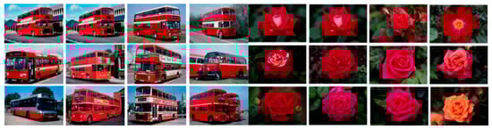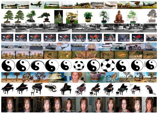 Caltech 101 is a digital image data set created in September 2003, and it contains 9146 images in total, which are divided into 101 distinct object categories (for instance, faces, watches, ants, pianos, etc.) and a background category []. The Corel image database is the most commonly used database to test the performance of image retrieval. In our experiments, we used two Corel subsets, i.e., Corel 1000 and Corel 10000 []. The Corel 1000 database consisted of over 1000 images in 10 categories, with each category containing 100 images. Every image in the database had the sizes of 256  384 or 384  256. The Corel 10000 database consisted of 100 categories including diverse content such as beach, car, door, sunset fish, and so on.