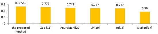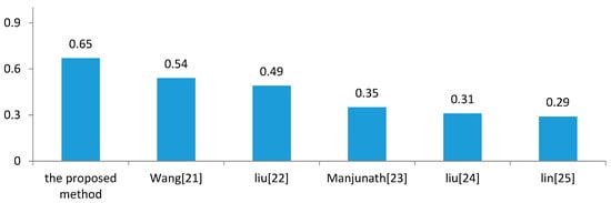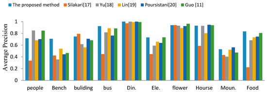 Figure 6, Figure 7 and Figure 8 show the comparison of the experimental results between the proposed scheme and other schemes. In this experiment, the number of retrieved images, L, was 20. Figure 6 shows that the proposed scheme cannot consistently obtain the best average precision in every image category. For example, in the “People” category, Yu’s scheme [] produced the best results and Silakari’s scheme [] provided the best results in the “Building” category. Despite this, our scheme achieved a stable average precision rate. In addition, the time complexity of our scheme is  while the proposed scheme by literature [] is also . Although the proposed scheme used the same feature descriptor as Guo’s scheme [], it provided better retrieval results because the BACOBTC had better image quality than ODBTC. Figure 8 shows that the proposed scheme achieved better performance than the other schemes in the Corel 10000 image database. Therefore, we can conclude that the performance of our proposed scheme is superior to the other schemes in color image retrieval.