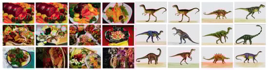 Similar to the experiment of [], Figure 9 show four examples of image retrieval results for the Corel 1000 image database. The image at the top of the left-top corner is the query image and the rest are the 11 most-similar images. In this experiment, the proposed scheme had higher precision and better performance than the scheme in Reference []. In the literature [], there are color mismatched images in the “bus” and “flower” categories and irrelevant images in the “food” category. However, as shown in Figure 9, the retrieved images are food images in the “food” category and their colours perfectly matched the query image in the “bus” and “flower” categories. The reason the precision of the proposed scheme was higher than that in the literature [] was that  and  were used to describe the color features, obtaining the main color characteristics of the original image. In addition, we used a probabilistic approach to describe the images’ textural information in the computation of , so the images’ right-and-left symmetry did not affect the results when the images were retrieved. As shown in Figure 9, the most-similar dragon images were retrieved irrespective of the direction of the dragon.