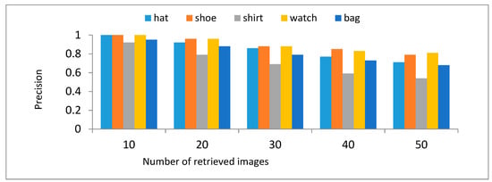 CBIR is widely used in many fields such as e-commerce [], medicine [], military, security technology [], multimedia digital library, Geographic information System [], architecture and engineering design [], intellectual property [], crime and security prevention etc. In this paper, the effectiveness of our approach is verified in e-commerce. In order to verify the feasibility and effectiveness of the retrieval scheme, this paper makes a simulation study on the online commodity retrieval system. The experiment uses the image database consisting of 1000 images in four groups (shoe, hat, watch and bag), in which each group contains 250 images. All images are from Taobao and other shopping sites. As shown in Figure 10, Our scheme also obtains good performance.