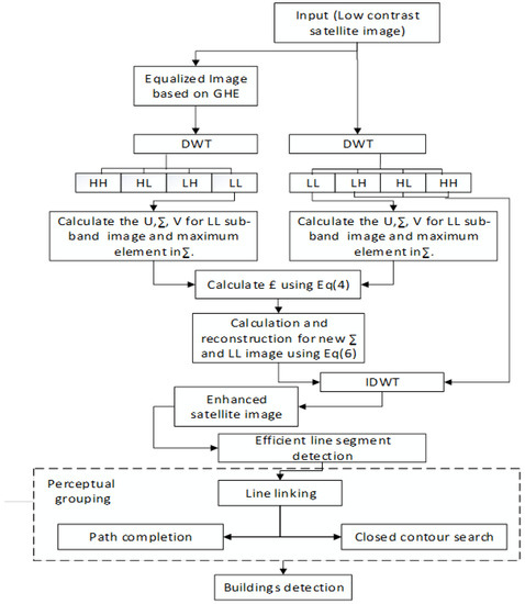 In this research paper, an efficient model is proposed for building detection from low-contrast satellite imaginary. The proposed method comprises two stages, i.e., contrast enhancement and building extraction. In the first stage, the input image is taken to improve contrast by using a DWT method of Fourier transform based on SVD. Then, the perceptual grouping approach is applied on the enhanced image to detect the buildings. The flowchart of the proposed framework is shown in Figure 1.