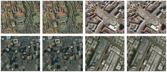 To evaluate the performance of the proposed approach, most of the analysis was carried out on an image obtained from the QuickBird satellite [62], which was launched in October 2001. The imagery is owned and operated by the DigitalGlobe Inc. (Westminster, CO, USA). QuickBird imagery provides both panchromatic and multispectral imagery. Later, it is publicly made available to use for a wide variety of remote sensing tasks, such as building detection, road extraction, and contrast enhancement. It is one of the best possible options to evaluate the proposed method. All the experiments were performed in MATLAB 2015a with a PC with the specifications of Windows 10, 4 GB of RAM, and a 2.5-GHz CPU. To evaluate the performance of the proposed technique, four 512 × 512 low-contrast QuickBird satellite images were taken, as shown in Figure 8. The first row was the low-contrast image. The second row was an enhanced version. Row three was the result of the line segment. The last row was the building detection. Furthermore, the performance of the detection algorithm was assessed. The rate of detection correctness (RoD), the false negative rate (FNR), precision, recall, f-score and overall accuracy were derived from the following quantities: number objects correctly classified as buildings (), number of other objects classified as buildings (), and a number of buildings classified as another object (), which were based on the quantities given in Equations (8)–(13). Mathematically, these were defined as