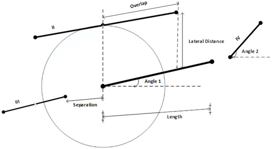Once the line segments are obtained, then collinear line linking criteria and line intersection detection are achieved to build a relationship between line segments and line intersections and the boundaries of the objects. The grouping of the detected lines in the previous step is produced by the criteria introduced by Izadi and Saeedi [35], as elaborated in Figure 5 and defined below: