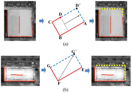 However, the process of detection could be affected due to many factors, such as image quality and interference in the background of the image. It can be seen in Figure 7 that the lines labeled in yellow failed to be detected previously, although it is not necessary that all lines should exist in the line sets. Therefore, the unclosed U-shape contour-based path on the most extended border AB is completed on the basis of the prior knowledge regarding building boundary shape, shown in Figure 7a. As shown in Figure 7b, the diagonal line of the present building block is used to complete the vertex G’, which was undetected previously. Like this, an isolated L-shape structure results in a completely rectangular shape.