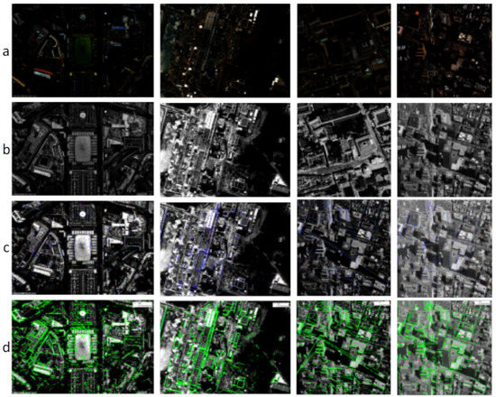 Row (a) is low-contrast satellite images; row (b) enhanced images; row (c) line linking; and row (d) building extraction.