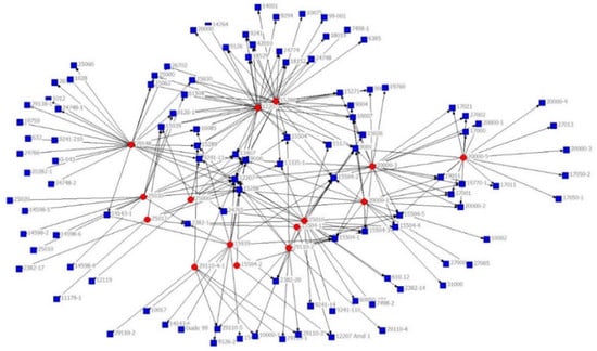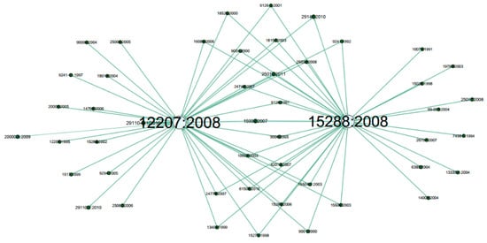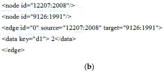 Final graph models are generated for further experiments following the GraphML (Graph Mark-up Language) format, which is an XML-based format for the description of graph structures, designed to improve tool interoperability and reduce communication overhead []. An XML graph file sample is given in Appendix A that also represents a graph shown in Figure 3. Eventually, relevant graph models are generated, and G1 = (V1, E1) (|V1| = 121, |E1| = 248) represents the entire network of 121 scientific standards collected.