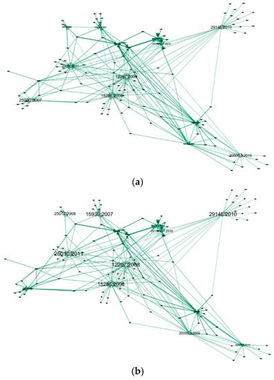 The Eigenvector centrality concept is adopted as a ranking measure to analyse the importance of standards. It attributes a value that represents the connection intensity among nodes; a higher value indicates a more important node, and a node with high eigenvector centrality is not necessarily highly linked (the node might have few but important links) [,,,]. For example, Google’s PageRank algorithm is a variant of eigenvector centrality. In this study, Eigenvector centrality measures the extent to which a standard interacts with other standards in the network. The PageRank centrality is also applied in graphs; it results from a random walk of a network. PageRank assigns probability distributions to each node denoting the importance of the node [,] via measuring the probability of being at that node during the random walk. At each node in a graph, the next node is chosen with probability from the set of successors of the current node (neighbours for the undirected case). If a node has no successors, the next node is chosen from all nodes, and nodes with higher importance are more likely to be chosen. Both the Weighted In-Degree centrality and the Weighted In-Degree centrality take into consideration the weights and direction of ties; both have been the preferred measures for analysing weighted and directed networks [,,]. Betweenness centrality is a measure of control (nodes with high Betweenness can control other vertices more), and Closeness is a measure of access (nodes with high Closeness can access other nodes more, thus having higher influence) [,].