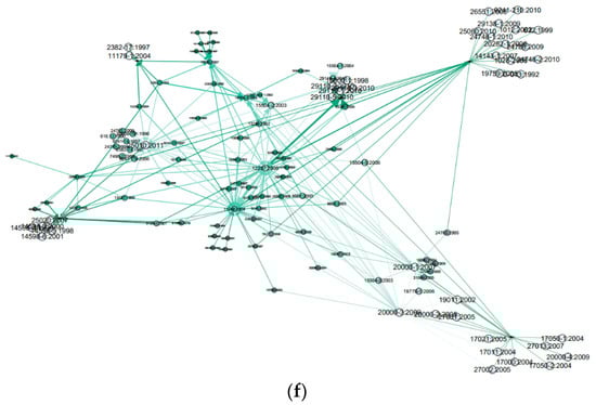 Visualisations of a standard graph for all measurements (FA2, |E| = 121, |V| = 248). Node size, colour depth and label size indicate standard rankings. For example, nodes with the larger size, darker green colour and larger label size are more important standards with higher rankings. (a) PageRank measurement (25030:2007 is the highest-ranking standard); (b) Eigenvector centrality measurement (25010:2011 is the highest-ranking standard); (c) Weighted In-Degree measurement (12207:2008 is the highest-ranking standard); (d) Weighted Out-Degree measurement (12207:2008 is the highest-ranking standard); (e) Betweenness measurement (12207:2008 is the highest-ranking standard); (f) Closeness measurement (Top ten ranking standards have the same value).