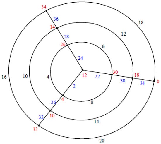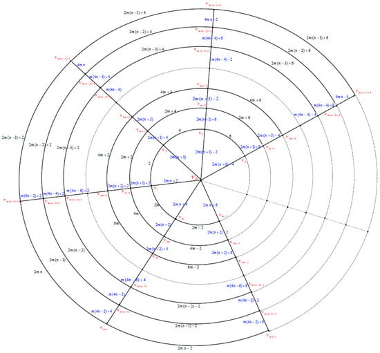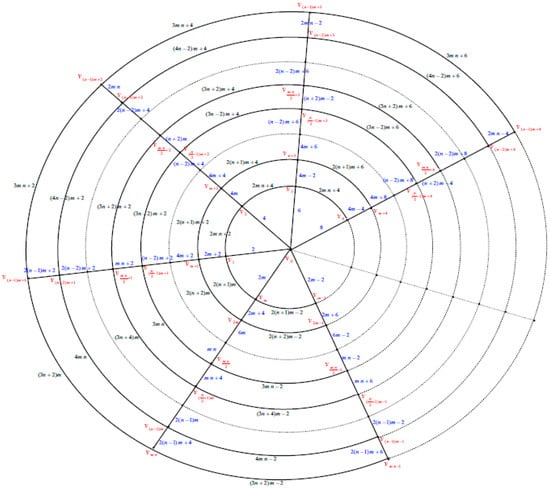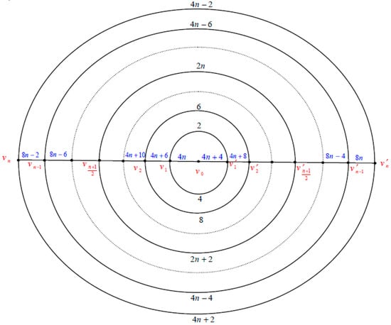 That is the labels of vertices of the most inner circle are assigned by , the labels of vertices of the circle are assigned by , the labels of the vertices of the circle are assigned by , the labels of the vertices of the circle are assigned by , the labels of the vertices of the circle are assigned by the labels of the vertices of the circle are assigned by and the labels of the vertices of the outer circle are assigned by . The label of the center vertex is assigned by , when , we have .