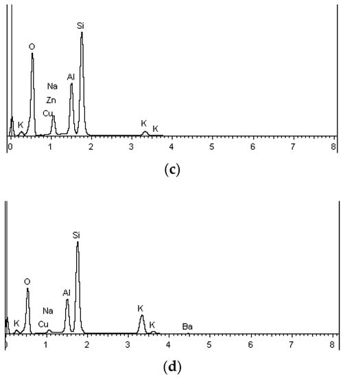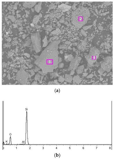 The rock samples tested were taken from the slope of open pit in San Shandao deposit []. According to the results of electron probe (Figure 3), the main compositions altered granite are SiO2 and K2O·Al2O3·6SiO2.