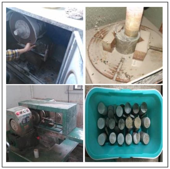 Samples were symmetrical cylinders that were 50 mm in diameter and 100 mm in length. The samples were obtained through core drilling and sawing (Figure 4).