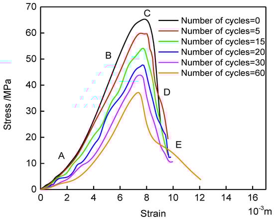 According to Figure 5, the uniaxial compression stress-strain curve shows five distinct stages, including internal defect closure stage (OA), linear elastic deformation stage (AB), unsteady rupture stage (BC), plastic yield stage (CD) and strain softening stage (DE). The peak strength of the rock gradually decreases as the number of cycles increases.